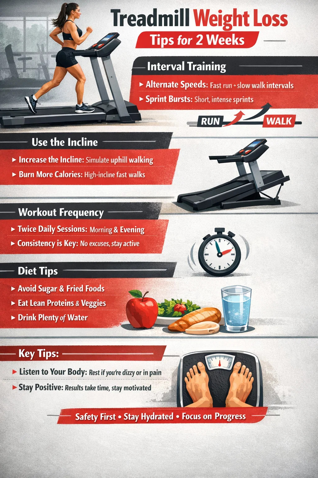 Maintain a positive mindset: Everyone's body is different, and the numbers on the scale may fluctuate. As long as you've put in the effort on the treadmill these two weeks, you will see noticeable changes in your physique and overall well-being.